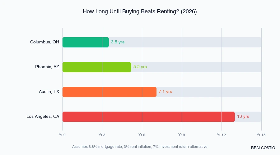 *Assumes 6.8% mortgage rate, 3% rent inflation, 3.5% home appreciation, 7% investment return alternative.*